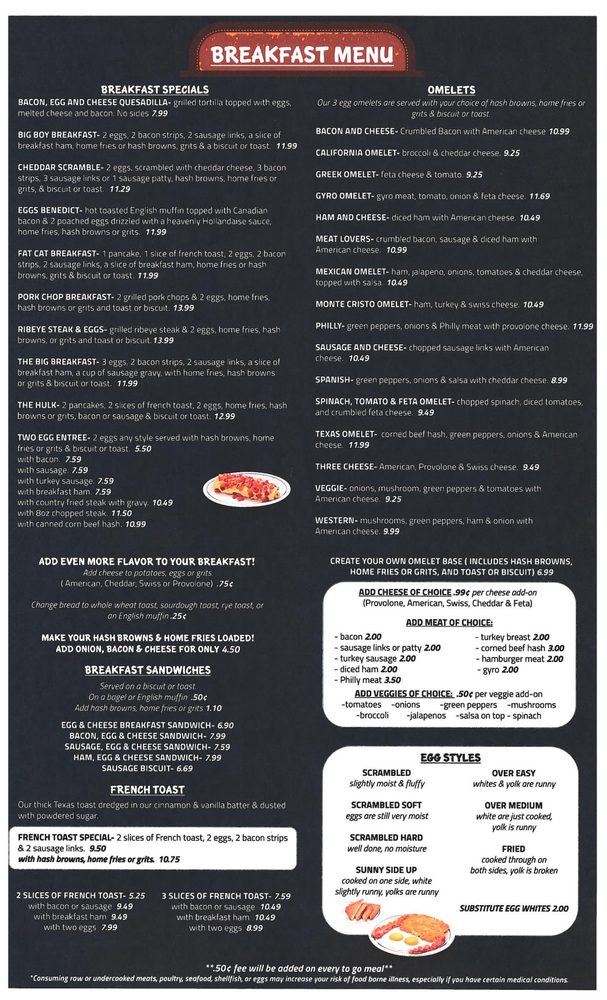 Diced bacon with American cheese. Choose a style: egg whites ($1), regular. Choose a side: biscuit, wheat toast, white toast. Choose a 2nd side: grits, hash browns, home fries.